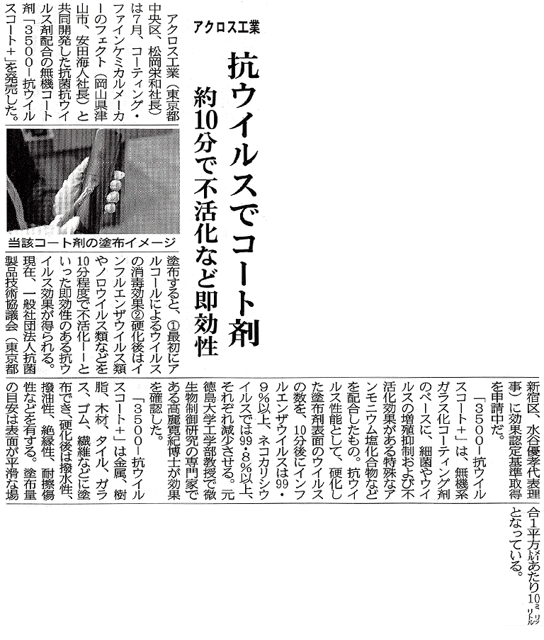 「抗ウイルスでコート剤 約10分で不活化など即効性」3500-抗ウイルスコート+ が、住宅産業新聞に掲載されました。(2020.9.3)